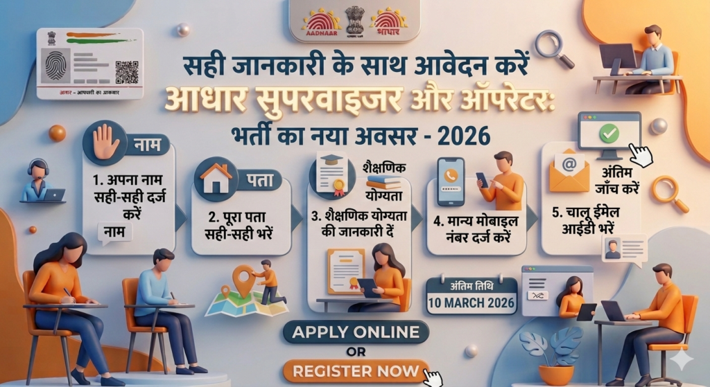 इस लेख में हम आपको बताएंगे कि CSC Aadhaar Supervisor Recruitment 2026 के लिए आवेदन कैसे करें, पात्रता क्या है, महत्वपूर्ण तिथियां क्या हैं और तैयारी कैसे करें।